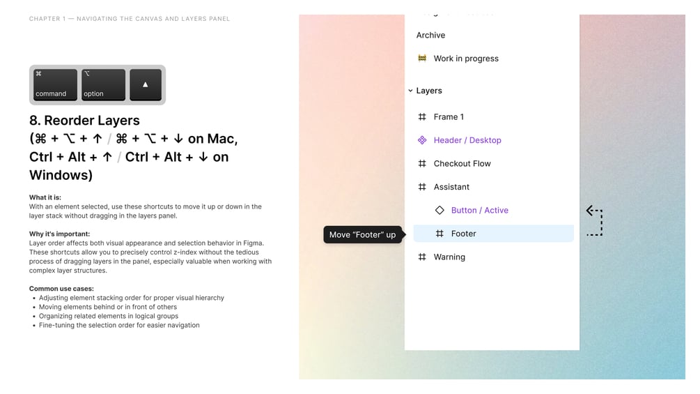 A .fig file containing targeted exercises to build your shortcut muscle memory and mastery. Import this file into Figma to practice real-world scenarios that reinforce each shortcut in context.